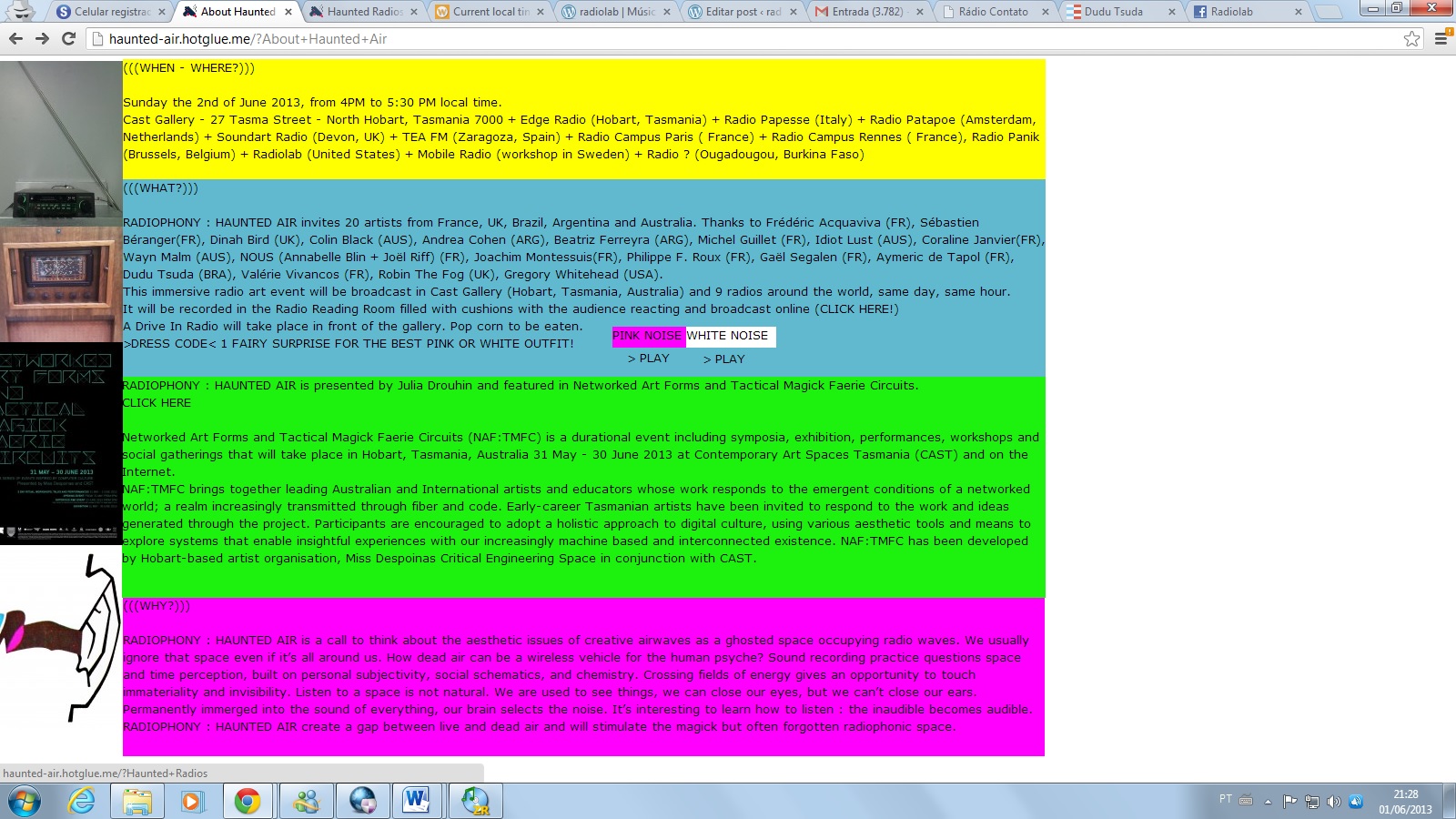 A Radiolab participa neste domingo (02.06.13) da transmissão de Radiophony : Haunted Air. O programa de 97 minutos é apresentado pela australiana Julia Drouhin e reúne trabalhos de 20 artistas da França, Brasil, Reino Unido, Argentina e Austrália. O brasileiro é Dudu Tsuda.